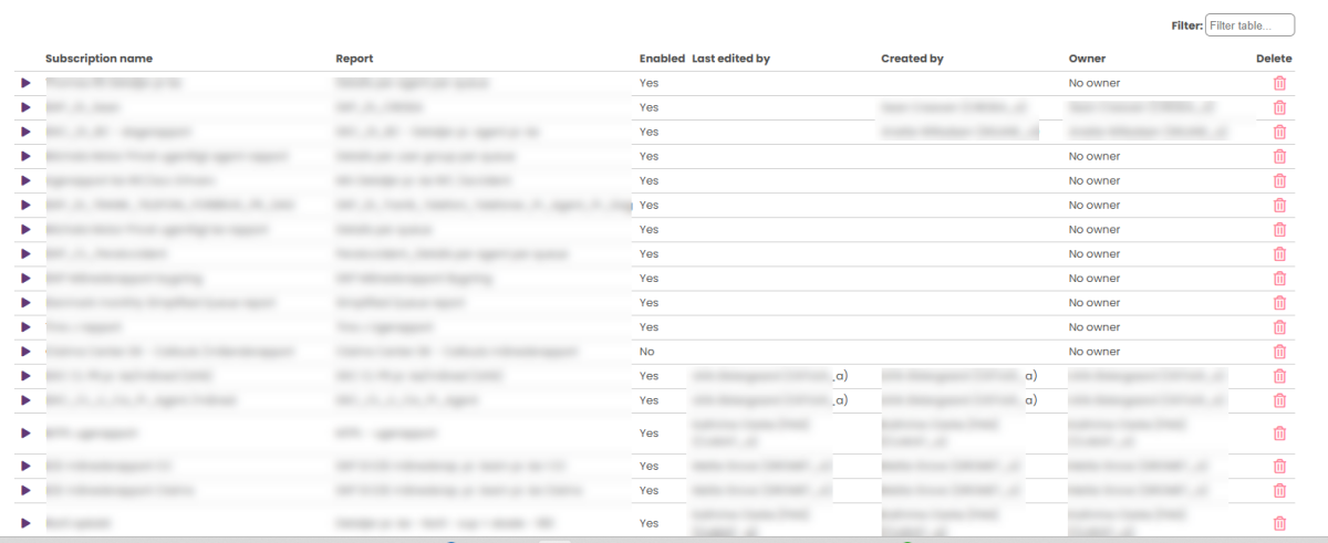 From May 14th 2025 we started making Report subscriptions ‘personal’. On this day we introduced “Owner”. An existing Report subscription’s owner was set to be the one that created it, and if this user was deleted, the Owner was set to be the user who last edited it. If the creator/last edited user was Puzzel support or a partner user, the owner was left empty.