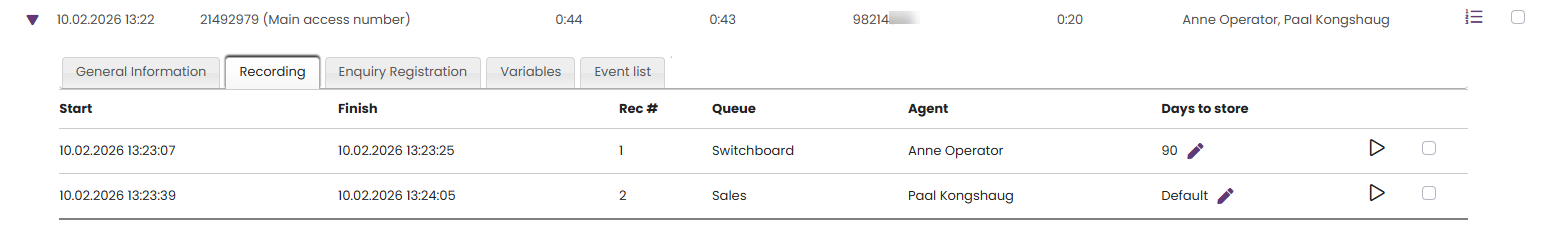 If you expand a call (row) that has been recorded, you will see a Recording tab in addition to the General information tab for this call.