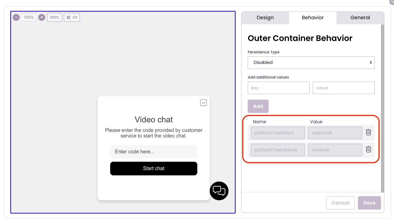 • Behavior configuration on the panel’s outer container to define the chat type and UI mode