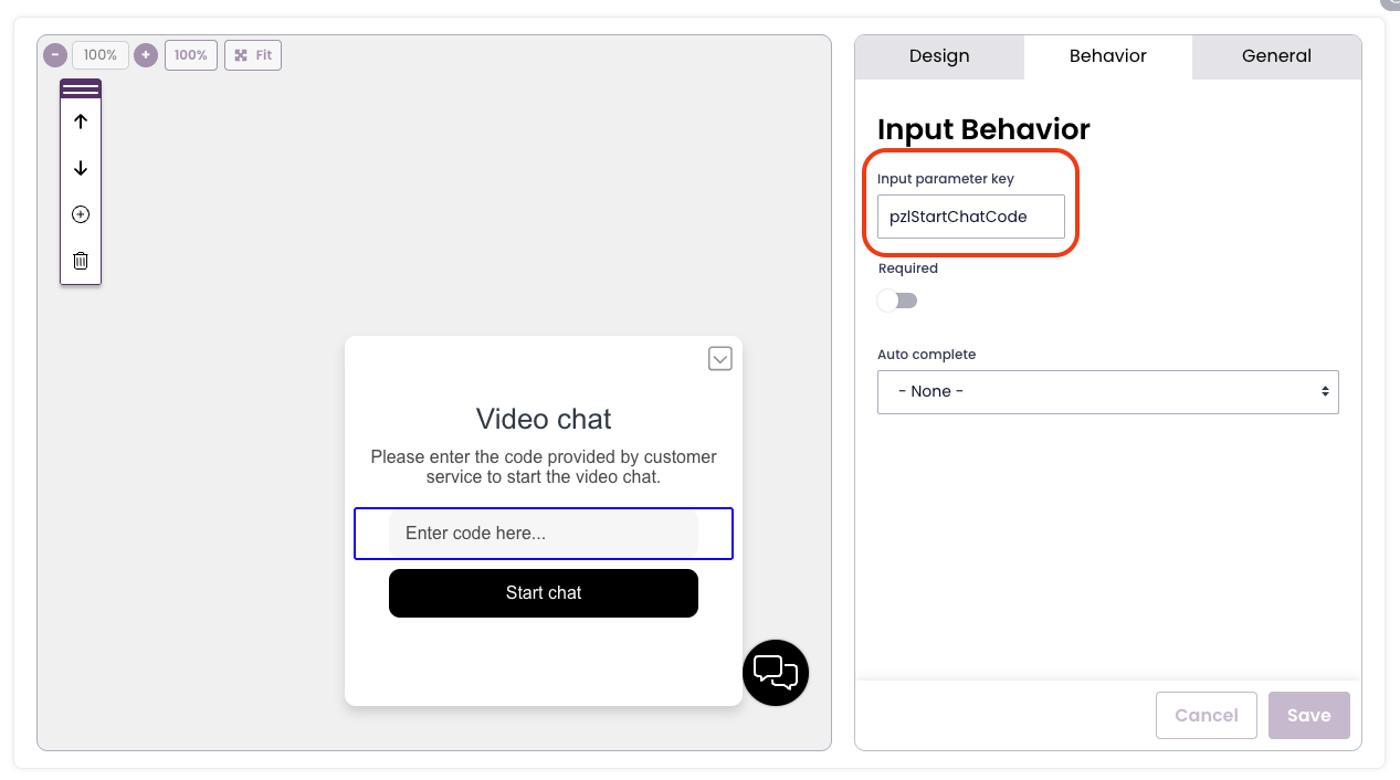 • Behavior configuration on the input field to pass the visitor-entered code to the chat engine