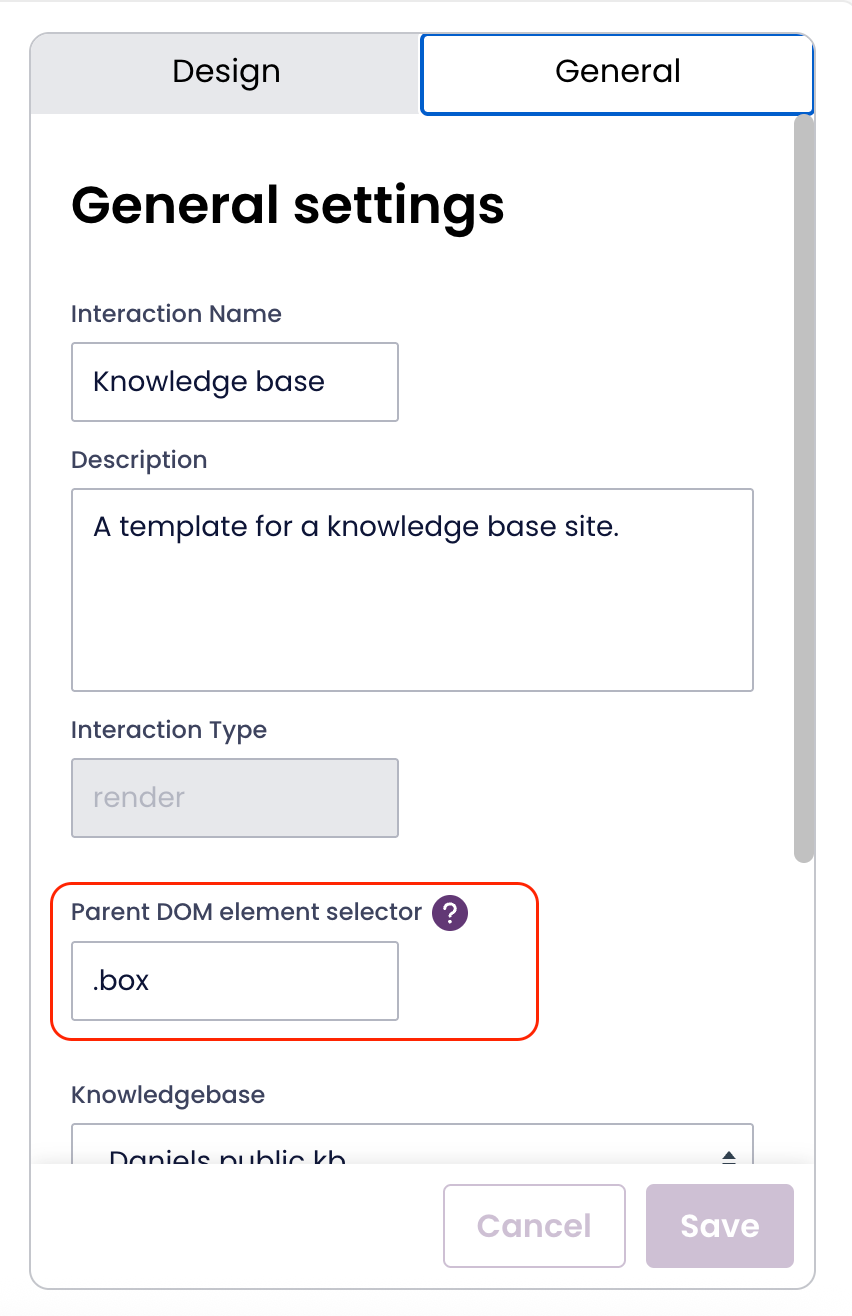 When the design is finished the next step is to incorporate the Public FAQ as a part of a website. A existing element of the website should be entered in the input field “Parent DOM element selector” in Puzzel Admin. The size, placement etcetera is handled in the code of the webpage.