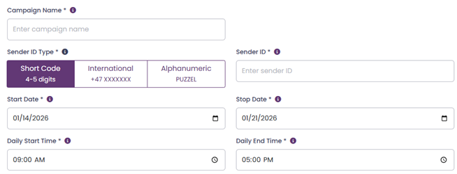 Help functions are generally available on the Puzzel SMS Campaign pages.