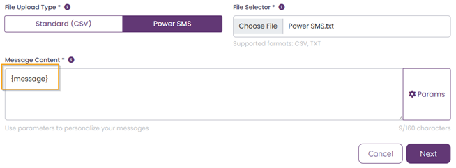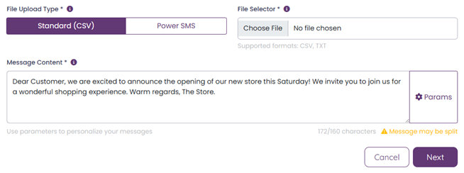 • The file you select must be a CSV file. Recipients must be listed with a single number per line, or with one number and parameter per line. File formats are described in the following sections.
