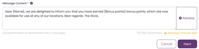 • Param: This function allows you to insert unique values for each recipient, for example, if your company wants to notify customers of their individual bonus point balances. Create a file in which you have recipients downwards. You then use a semi-colon (;) after each number and enter the parameter value (e.g. Name, bonus) as follows: