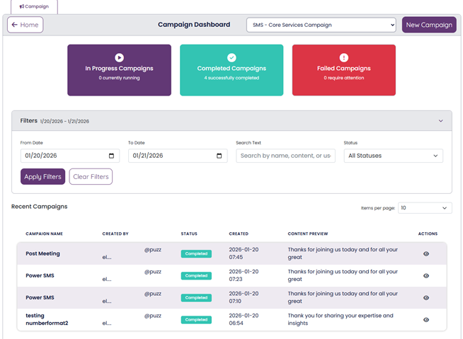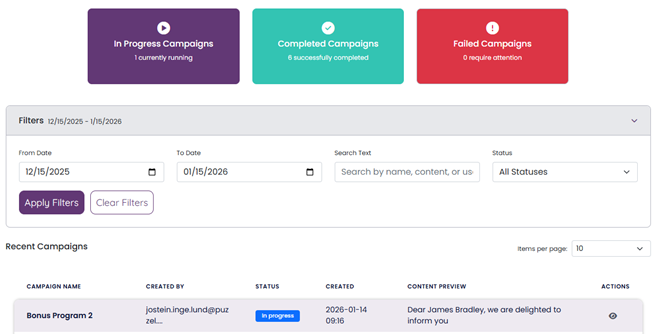 This view displays all campaigns scheduled, active, or completed within the chosen timeframe.You can apply filters to specify your search according to your preferences.