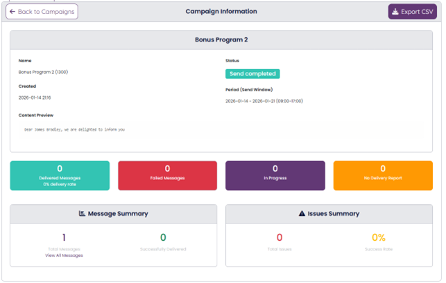 Once the campaign is sent, you will be redirected to the “Campaign Dashboard” where you can monitor the current campaign or review previous campaigns.