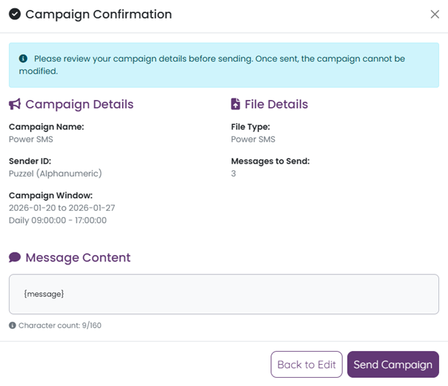 The Campaign confirmation will appear, allowing you to review the details before clicking “Send Campaign”