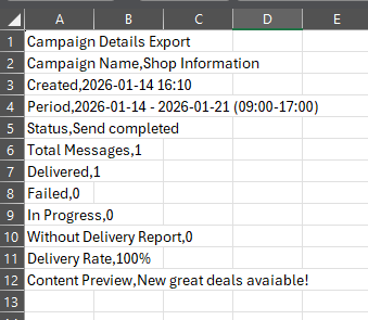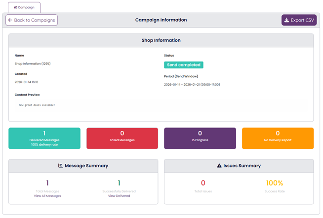 By clicking this symbol; under actions, you open the Campaign Information. This section provides all relevant details regarding your sent campaign, with the option to export the data to a CSV file.