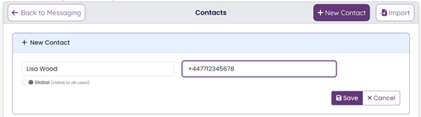 Users with an Administrator role can make a contact accessible for all Messenger users within your organization, simply check the Global option. Users without the Administrator role can make new contacts, but the contact will be marked as personal.