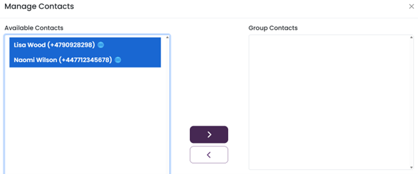 Transfer contacts from the 'Available' list to the 'Group' list. To select several entries simultaneously, hold the Shift key while clicking. Move the contacts by clicking the arrow button.