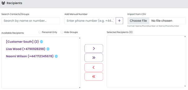 Choose your recipients from ‘Available Recipient’ and move to ‘Selected Recipient’ or add in manually or import from CSV.