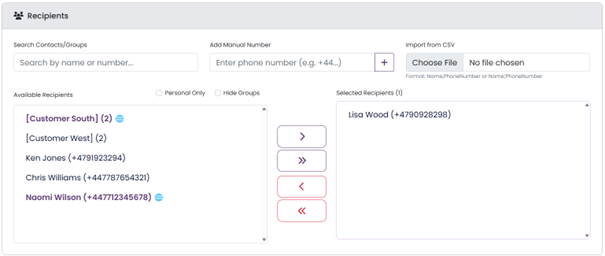 When sending SMS, you can now select entire contact groups, individual entries, or a combination of both. Additionally, the platform supports both bulk one-time imports and manual recipient entry for maximum flexibility.
