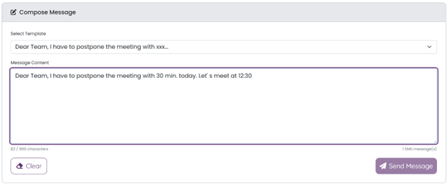 Compose your message, by typing in manually, or choosing from premade templates. You may edit your template in the Message Content window before sending.