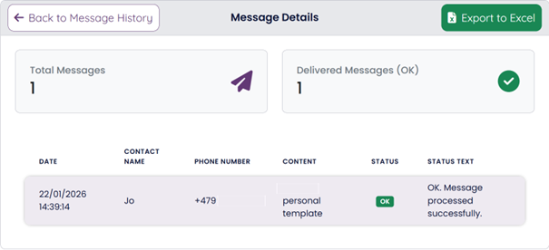This section provides all relevant details regarding your sent messages, with the option of exporting the data to Excel.