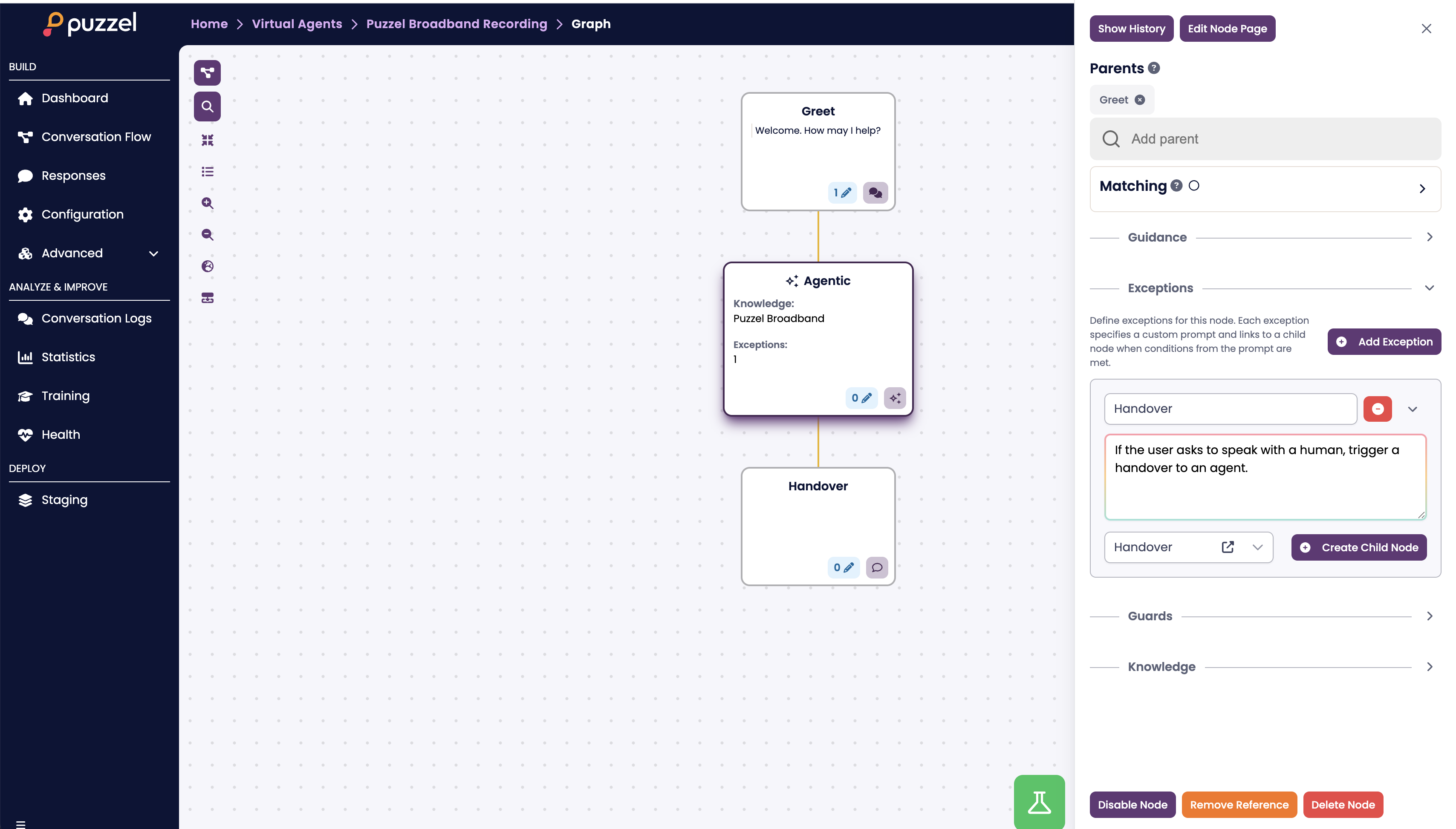 4. Each exception needs a name, a prompt describing when it should trigger, and a child node to route to.