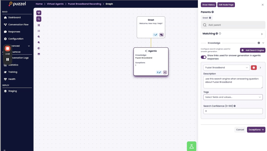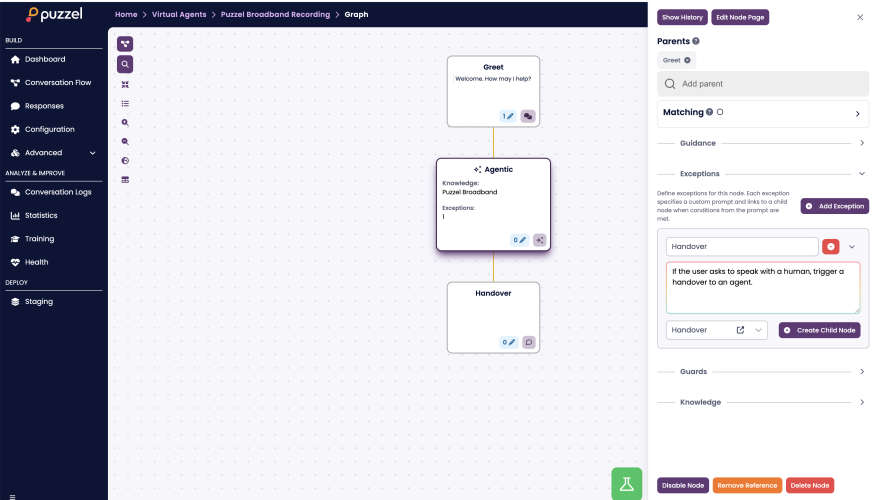 2. Add exceptions for cases where the agent should stop being autonomous and route to a deterministic flow or human queue.