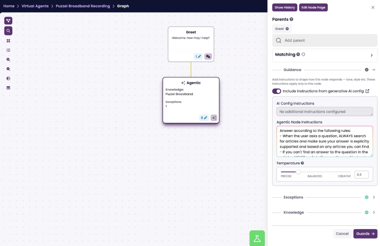 • Do not expect the Agentic node to replace every deterministic flow. Use it where flexible understanding helps, and keep fixed flows for transactions, compliance-heavy journeys, and sensitive workflows.