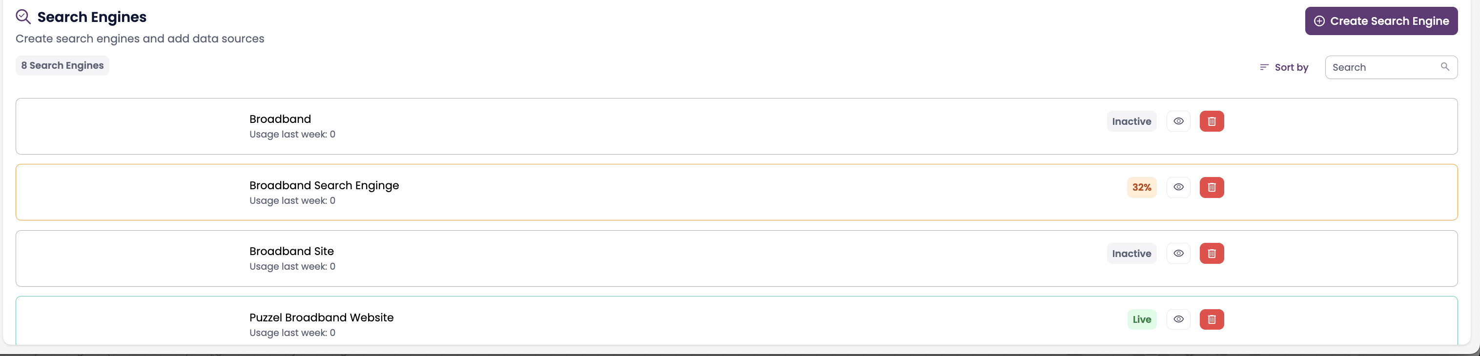 • Dashboard – View metrics, usage statistics, and get insights on your search engines.