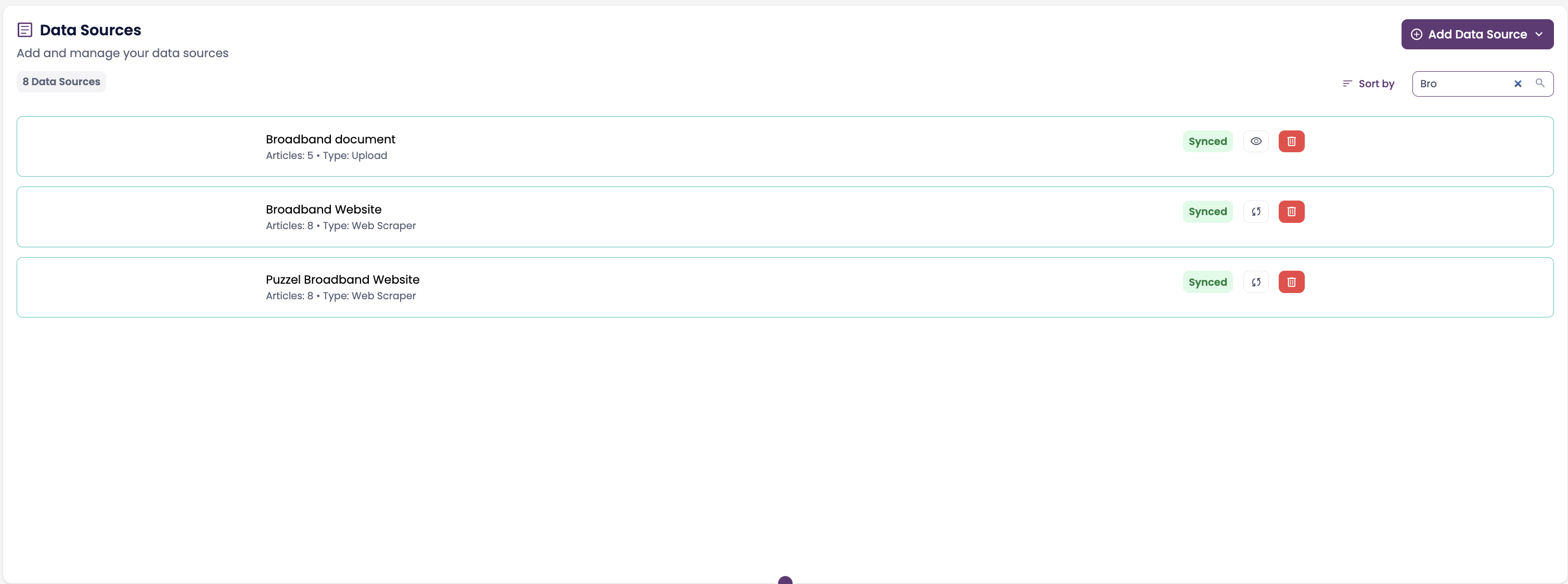 • Data Sources – Where you add and configure web scrapers, uploads, or third-party connectors.