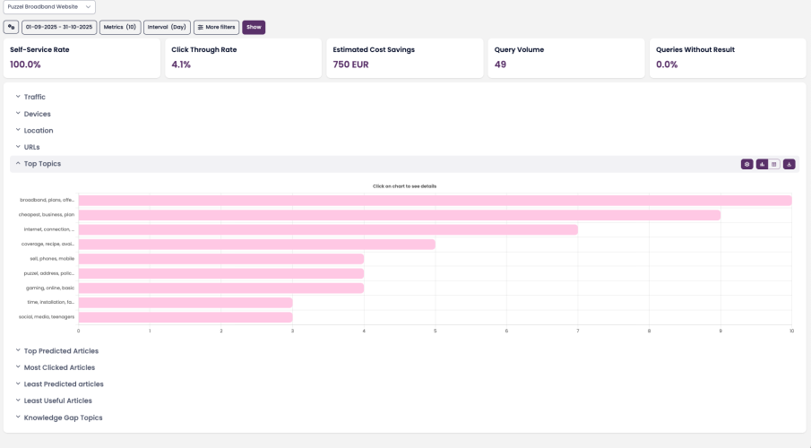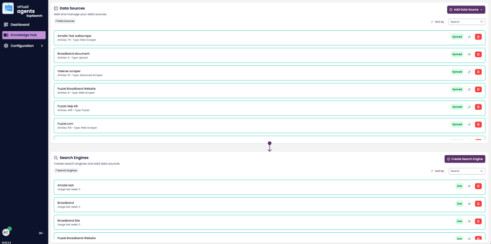 Each section is designed to make it easy to manage, monitor, and evolve your search engines used by the Virtual Agents or the Co-pilot.