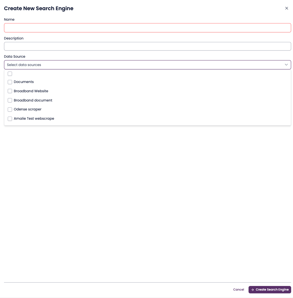 💡 Tip: A Search Engine is only as powerful as the Data Sources connected to it. Make sure your Data Sources are synced and ready before creating a new Search Engine.
