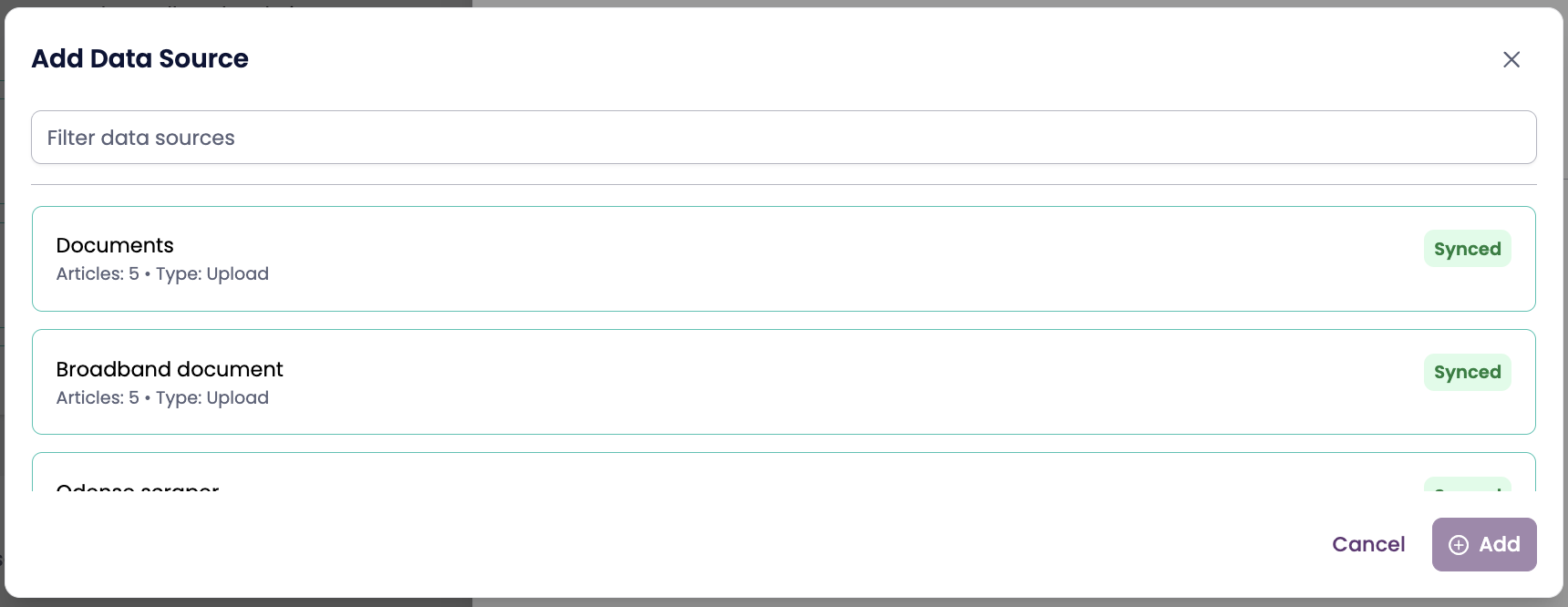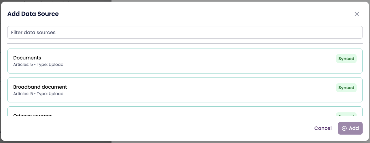 3. Select one or more synced sources (e.g., Puzzel Broadband Website, Documents).