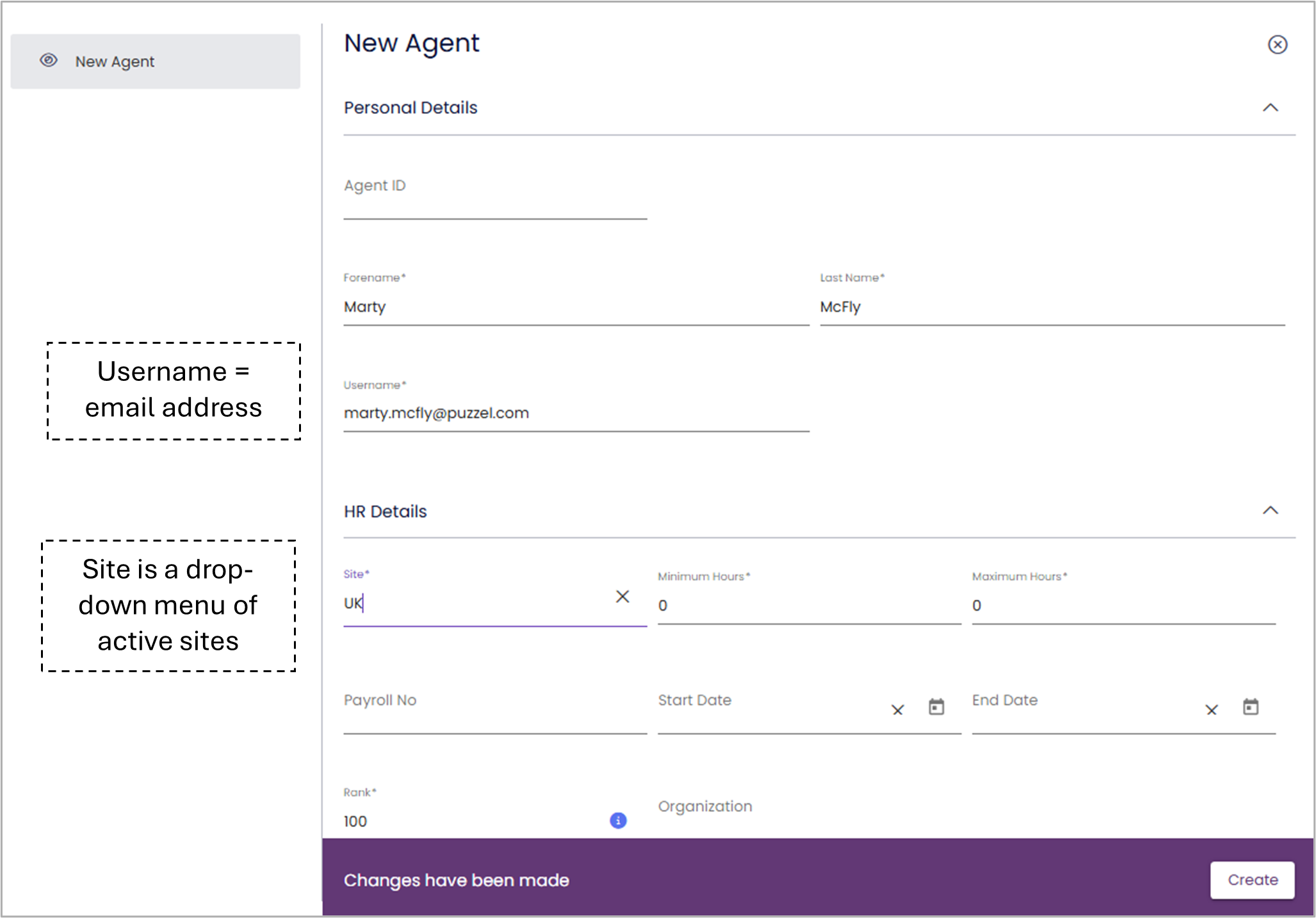 3. If you are manually adding the user, it opens up a form for you to fill in the user details. There are four mandatory details first name, last name, username and site, to be entered. Once you have entered all the necessary details, click on Create